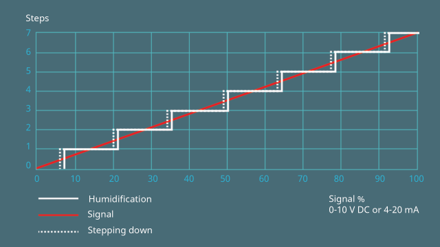 Die Regeleinrichtung im RLT-Gerät stellt sicher, dass die Sprühdüsen paarweise aktiviert werden, sodass die Wasserzufuhr stufenweise eingestellt werden kann.