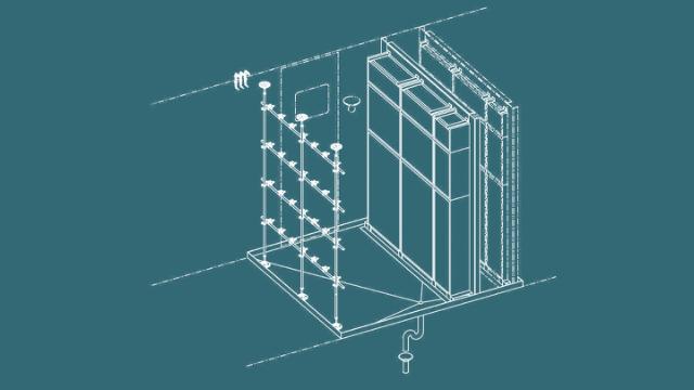 Diese Zeichnung zeigt den zentralen Teil des kanalgebundenen Systems – das RLT-Gerät. Auf der linken Seite wird Wassernebel aus der richtigen Entfernung in die Kammer eingespritzt. Die Abscheideplatten auf der rechten Seite sorgen dafür, dass keine Tropfen in den Luftkanal gelangen, sondern nur Wassernebel. Unten ist ein Bodenabfluss zu sehen, der überschüssiges Wasser aus dem System leitet. Das gesamte System ist korrosionsbeständig, hygienisch und wartungsfreundlich.