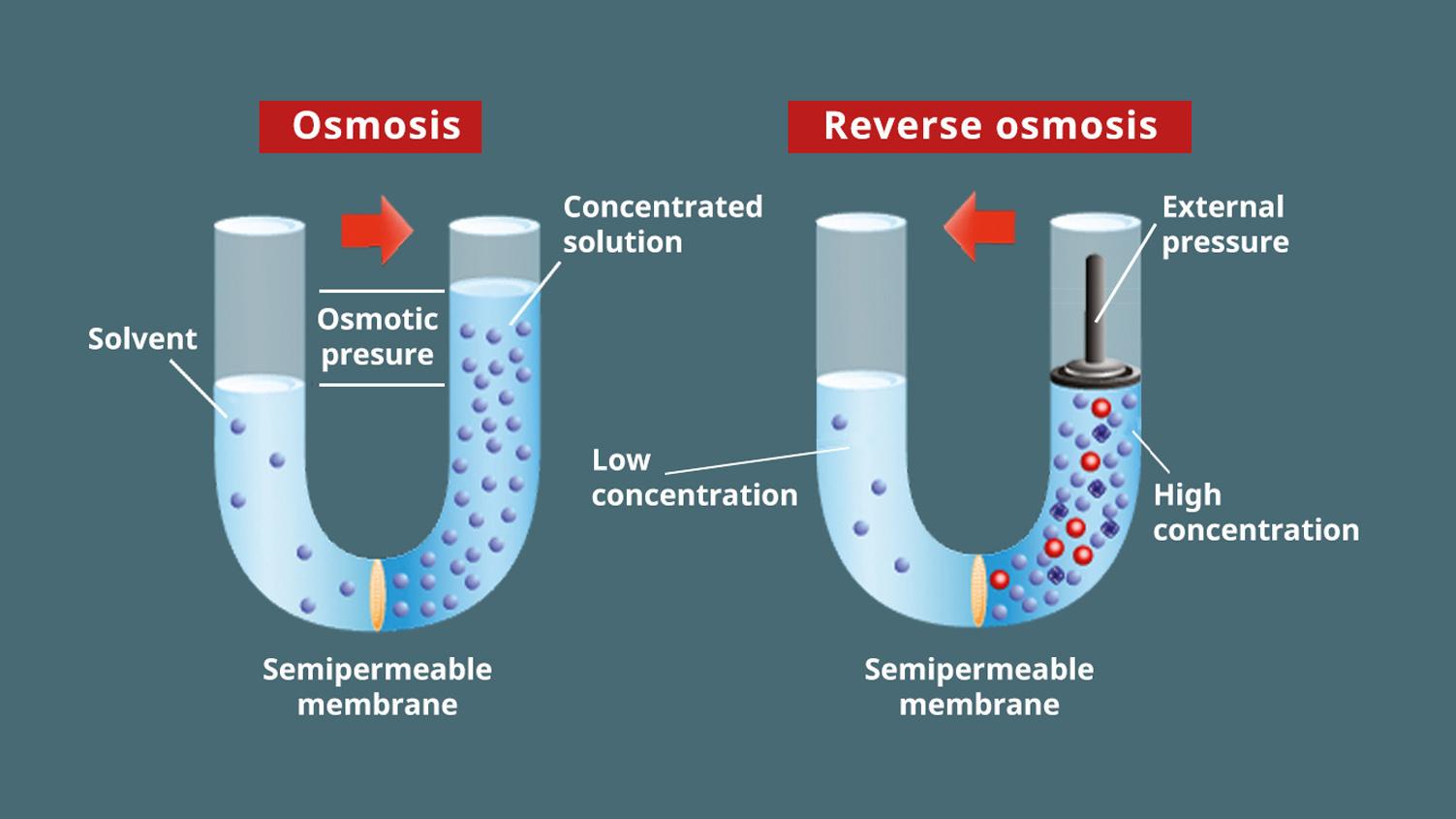 Die Anwendung eines Drucks oberhalb des osmotischen Drucks zwingt das Wasser durch eine Membran mit mikroskopisch kleinen Poren – kleiner als Bakterien und Viren.
