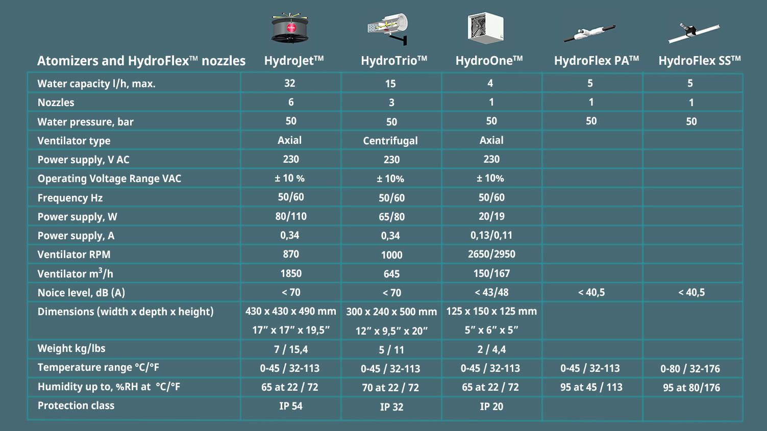Zur Gewährleistung einer vollständig integrierten Luftbefeuchtungslösung ist die Wahl der Düse und des Zerstäubers von entscheidender Bedeutung. Airtec®-Zerstäuber und -Düsen sind unter den Markennamen HydroJet™, HydroTrio™ und HydroOne™ erhältlich.