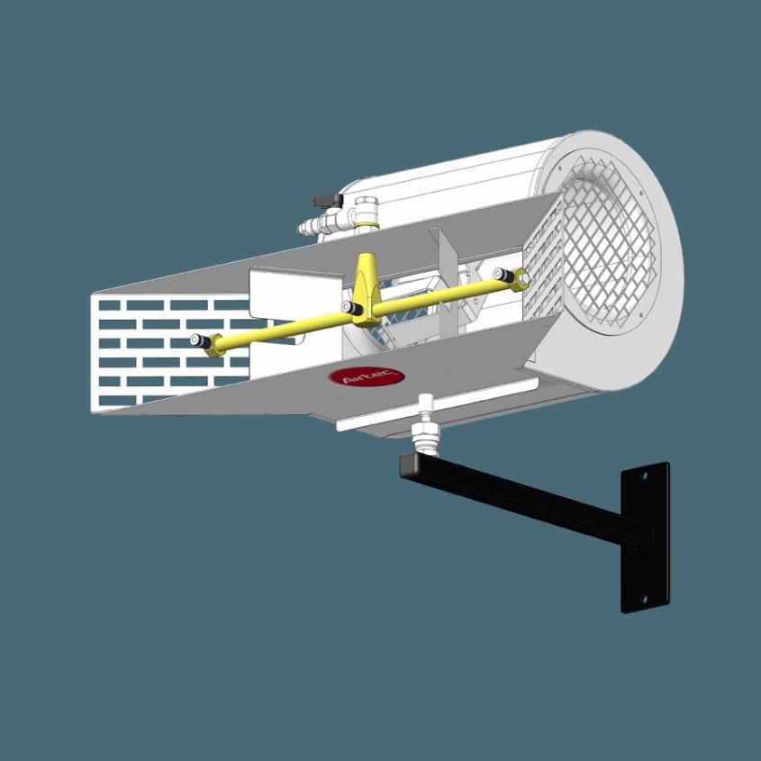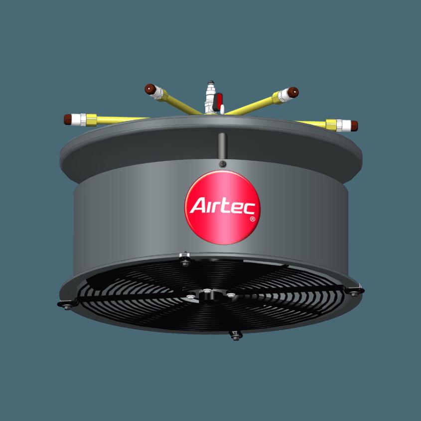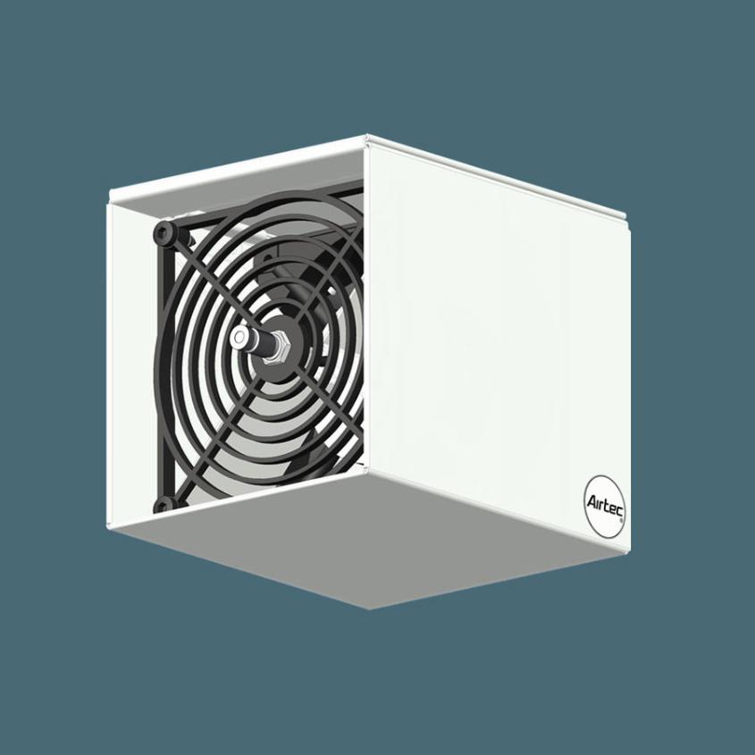 Jeder Zerstäuber ist mit einem Lüfter ausgestattet, der die Düse mit warmer Luft versorgt und eine schnelle und sichere Verdunstung des zerstäubten Wassers gewährleistet. Die Zerstäuber sind so ausgelegt, dass sie unter verschiedenen Bedingungen aus einer Höhe von 2,5 Metern und höher über dem Fußboden betrieben werden können.